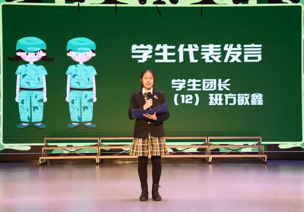 随后,学生营长、高一12班方敏鑫作为代表发言。她结合参与开营呼号、武器操作、战术演练、大国重器参观等活动的经历,讲述了同学们如何在实践中体会责任与担当。她也提到,活动中大家团结协作、各展所长,在自律管理、文艺宣传、内务安全等方面积累宝贵经验。发言中,她特别感谢老师们的全程陪伴,并鼓励大家将国防教育中锻炼出的坚韧意志延续到今后的学习与生活中。