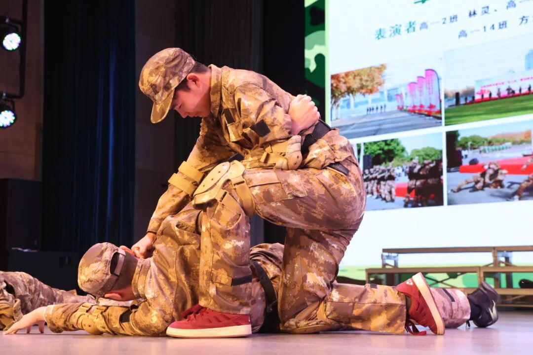 在学生发言之后,我校8名入选上海市军事体育人才储备营的同学进行了训练成果展示。捕俘拳简洁凌厉,“破锋八刀”刚劲有力,擒拿技巧巧妙实用,一系列演示生动展现了同学们在短期训练中取得的扎实进步。
