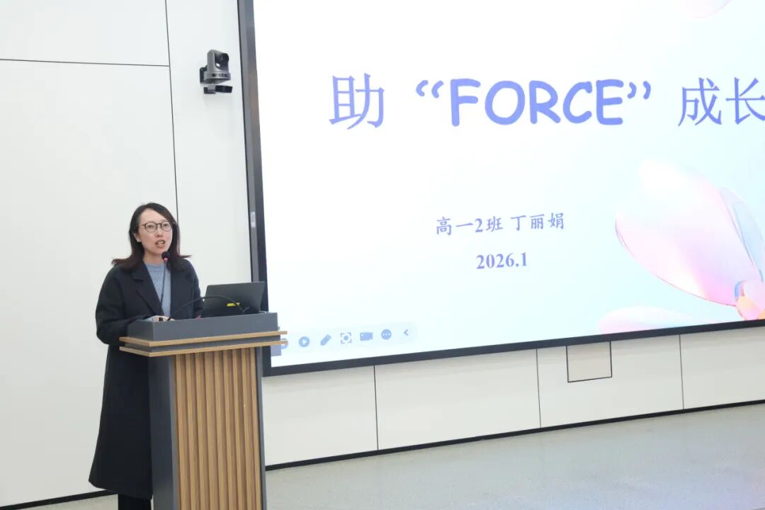 教师代表分享环节亮点纷呈,四位班主任从不同学段、不同维度,展现了德育工作的多元路径与深度思考。高一班主任丁丽娟老师以“助‘FORCE’成长”为主题,分享了用“制度框架、观察指导、弹性空间、协作意识”构建班级成长体系的实践。她通过制定晚自习公约、捕捉学生闪光点、包容成长“慢”节奏、搭建全员参与的管理平台,让41名学生在协作中凝聚合力,在规范中释放活力,生动诠释了“一群人才能走得更远”的育人理念。