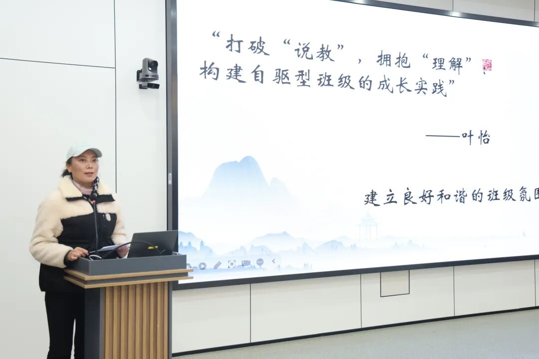 高二班主任叶怡老师聚焦“构建自驱型班级”,提出从“管控”到“赋能”的管理转变。通过自主竞选班干部,打造“无私奉献”的班级文化;她以亲身参与教室环境维护、陪伴学生参与校园活动排练等实际行动作出示范;同时建立每日夸赞机制,创设安全沟通空间,用具体的肯定与真诚的关心,走进青春期学生内心,让班级氛围在理解与尊重中愈发和谐。