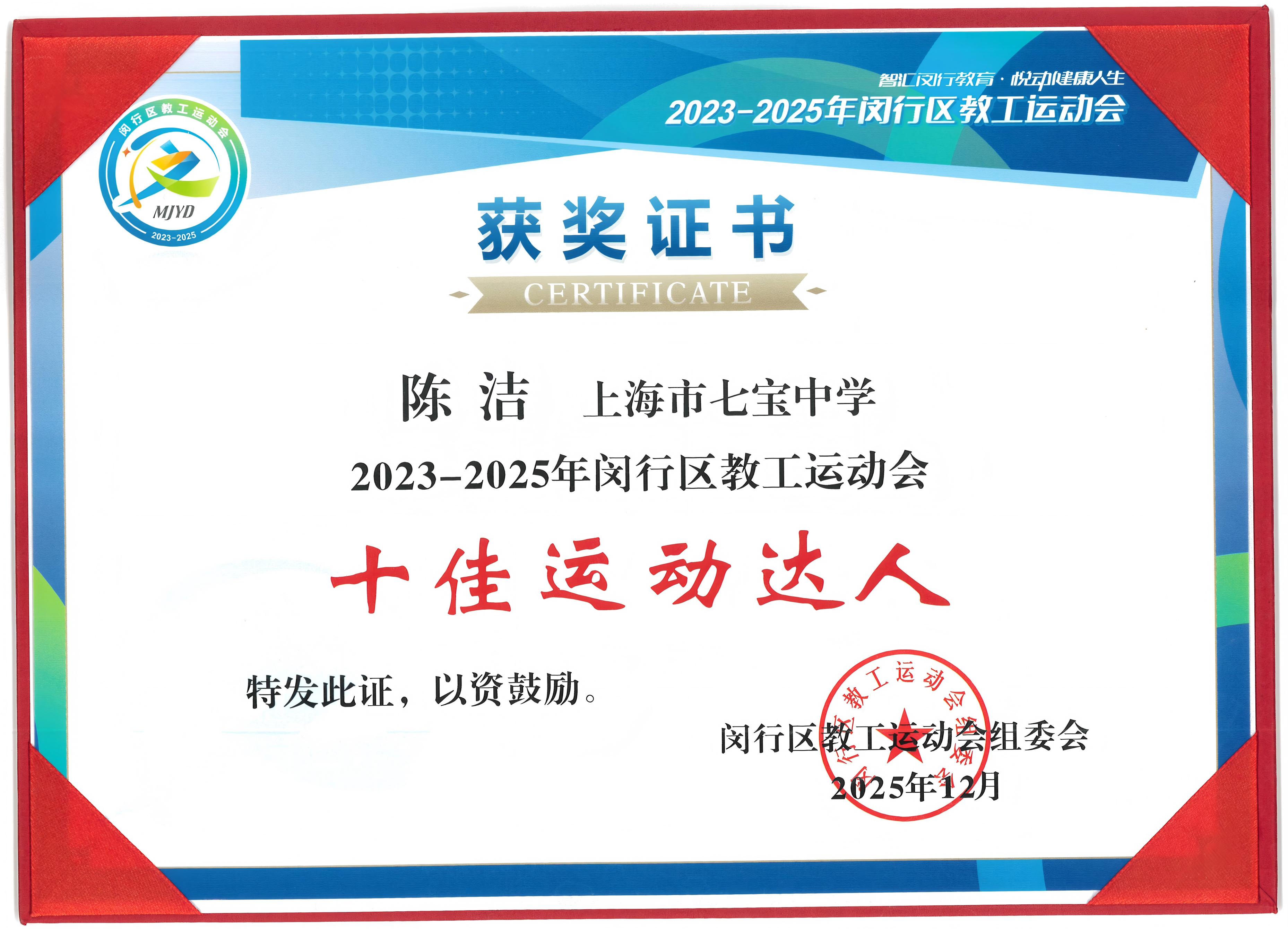 陈洁老师获2023-2025年闵行区教工运动会十佳运动达人