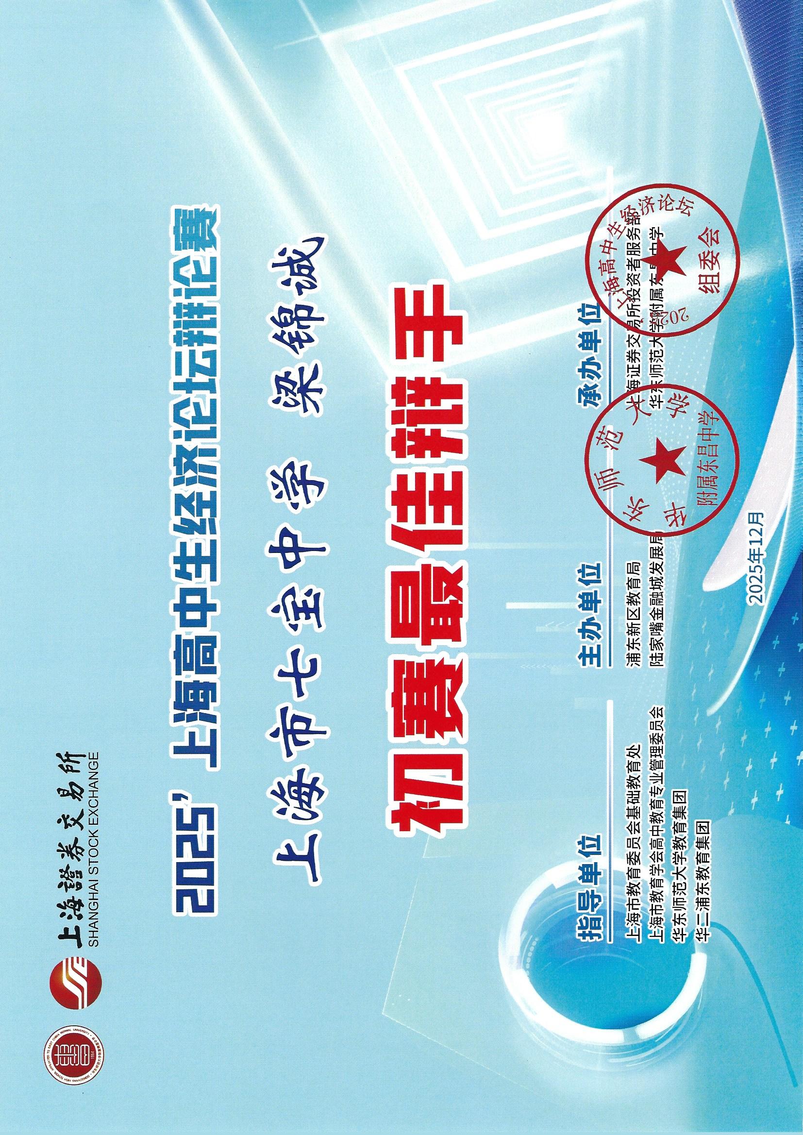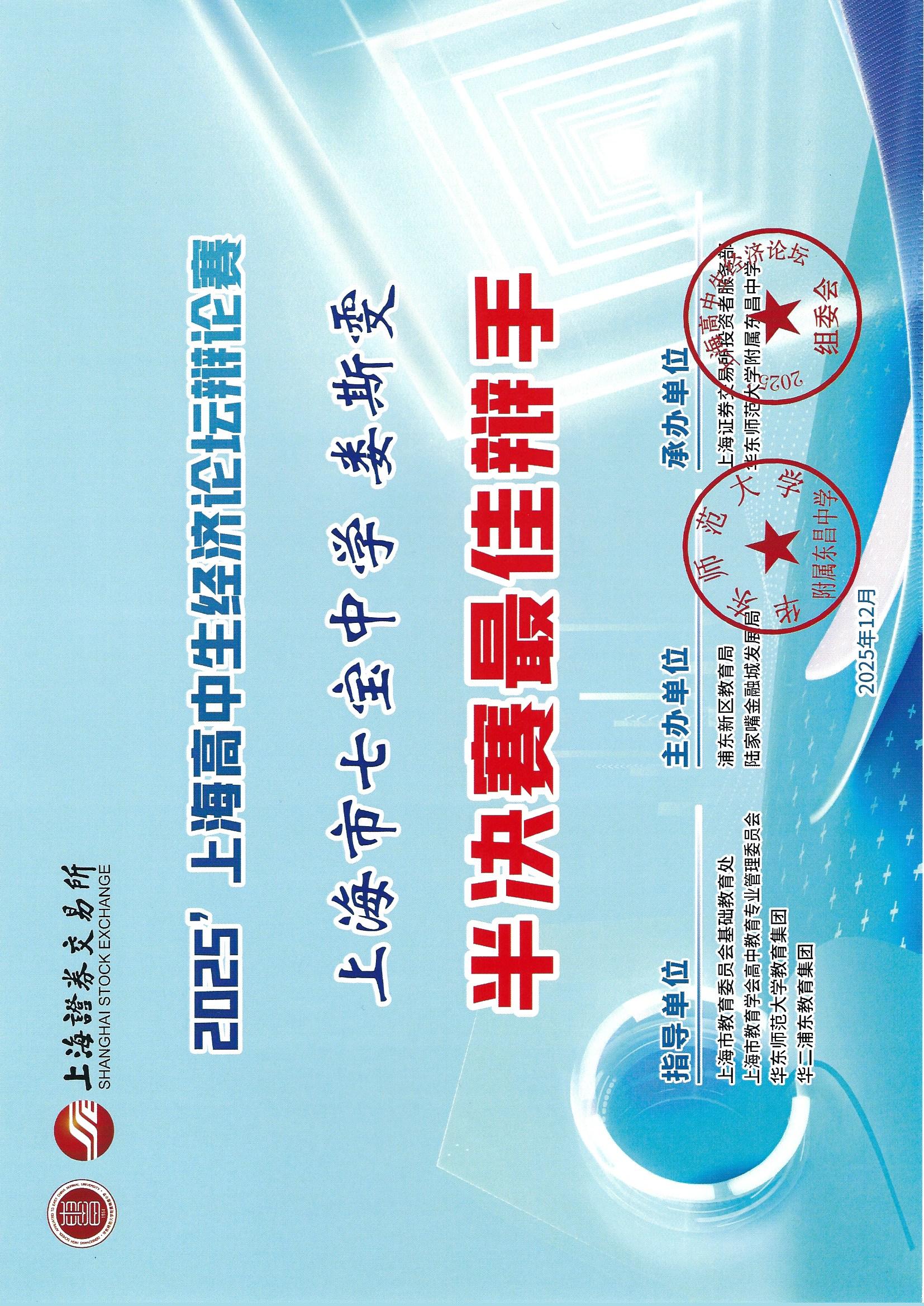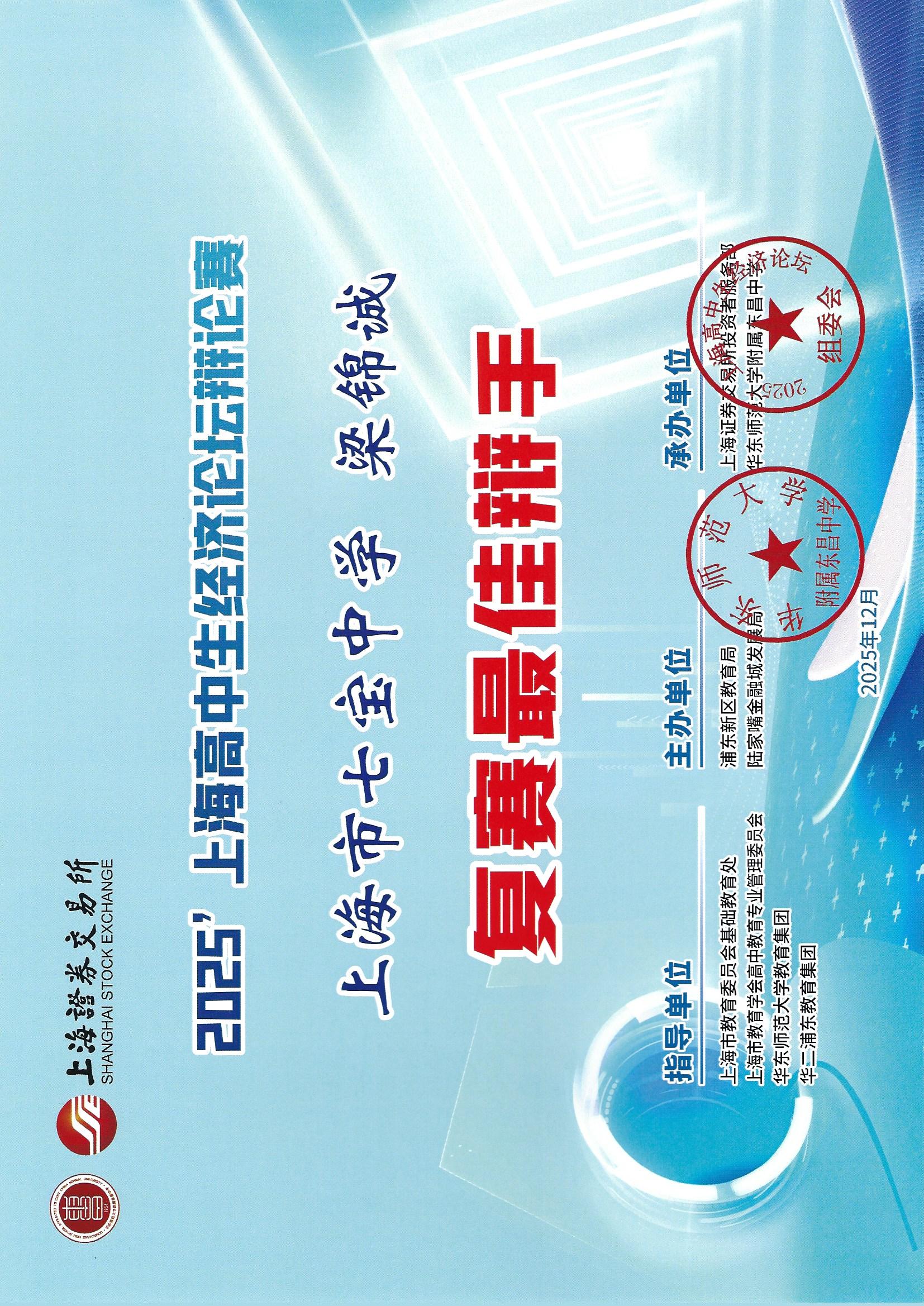 娄斯雯、梁锦诚同学获2025上海高中生经济论坛辩论赛最佳辩手