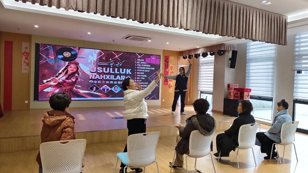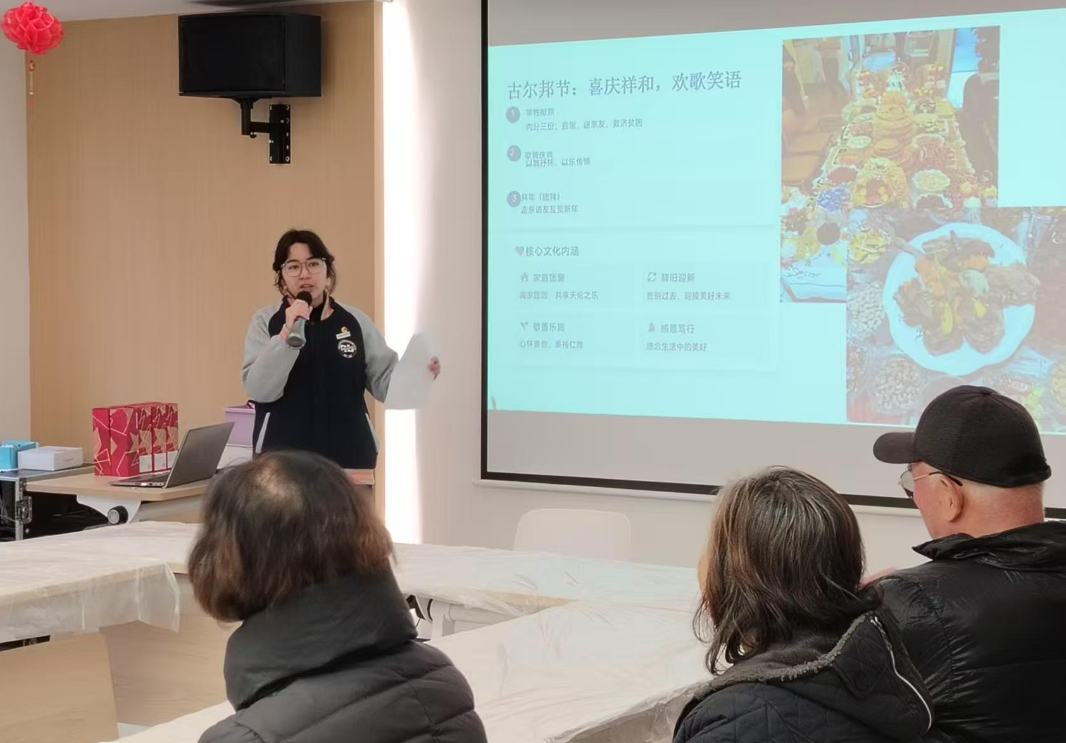 挂职实践首日正值腊八节,同学们与社区工作人员一同将热腾腾的腊八粥送至独居老人家中,在声声问候中传递温暖与关怀。随后的活动中,新疆学子主动成为家乡文化的“代言人”。