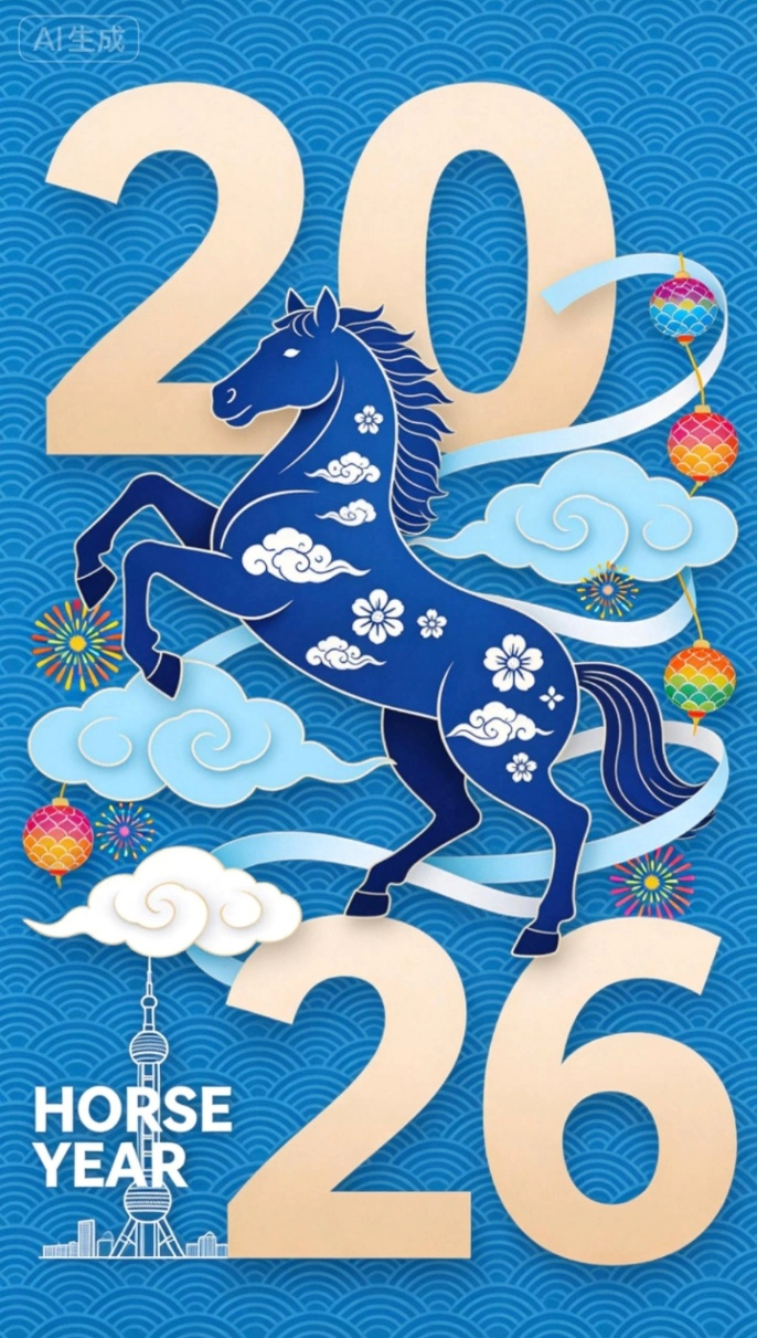 昂首踏云的骏马取自传统剪纸线条,镂空刻绘间透着利落;巨型“2026”数字破格而出,东方明珠等城市剪影点缀其下,让古老生肖与当代都市相拥。祥云梅花环绕,灯笼烟花升腾,既有节庆的热闹,又有新中式的雅致。作者以“以梦为马”寄语奋斗者,让这匹青蓝骏马,成为对青春沉静而热烈的祝福。