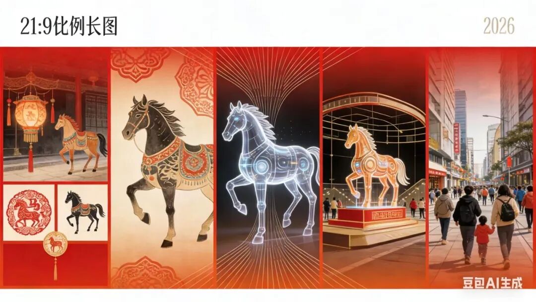 21:9的长图里,藏着一部“马的时空进化史”:从传统剪纸里的瑞马,到敦煌壁画里的鞍马,再到全息投影的机械马,最后是未来街头的巨型装置马。五段时空,五种形态,作者用分镜的方式,让马的意象从传统图腾一步步演变为科技符号。这不仅是创作,更是对文化传承与未来想象的思考。