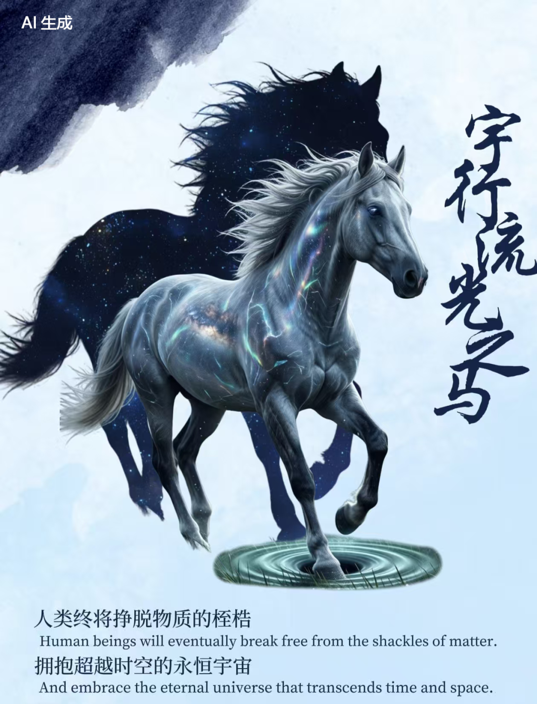 水墨晕染的背景里,一匹银白骏马踏水而来,它的鬃毛与身躯里流淌着璀璨星河,身后的影子是浩瀚宇宙。配文“人类终将挣脱物质的桎梏,拥抱超越时空的永恒宇宙”,瞬间把格局拉满。这是一幅充满哲思的作品,作者用浪漫的笔触,让马成为连接现实与宇宙的桥梁。