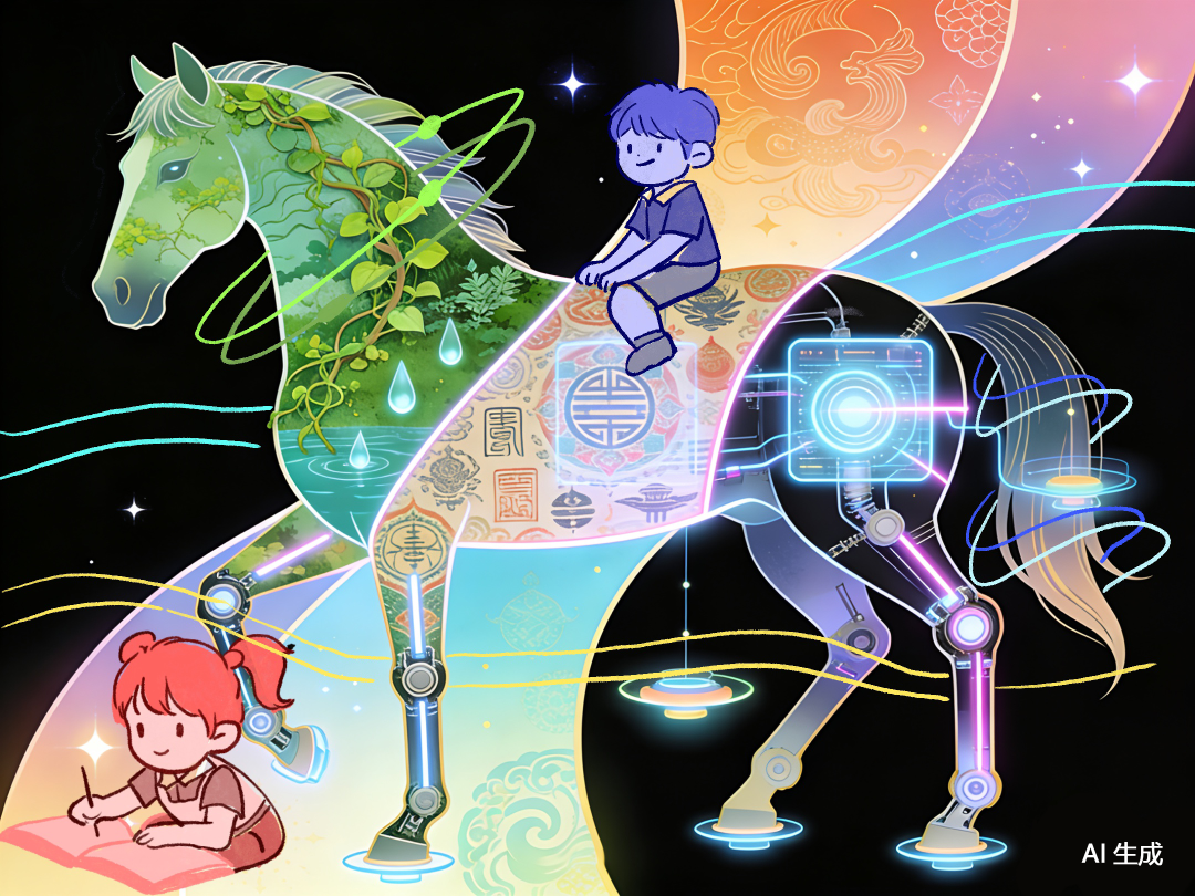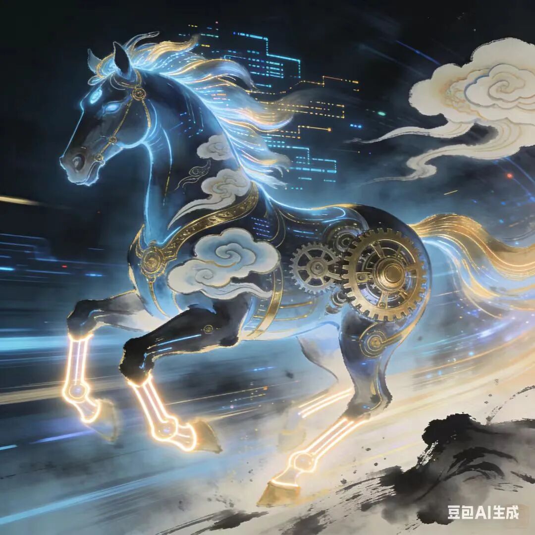 画面里的骏马一半是缠绕青藤的自然肌理,一半是流光溢彩的机械内核,少年策马而行,身后是渐变的日月星云。作者用线条打通了传统与科幻的边界:马年的少年,既能扎根自然,也能奔赴科技未来。这份“跨次元骑遇”,光是看着就觉得热血满满!