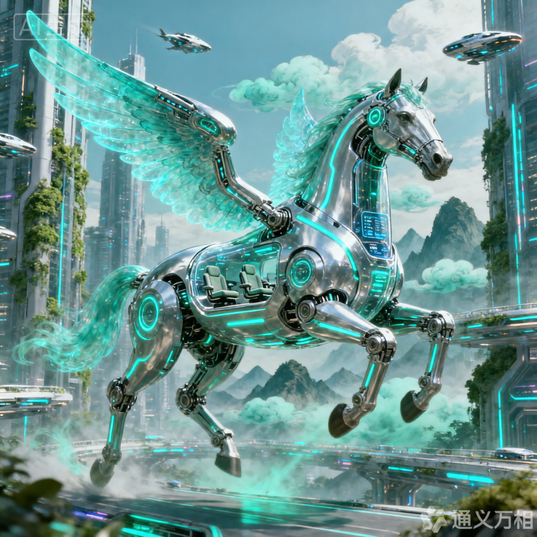 银白机械飞马舒展着透明的荧光羽翼,穿梭在绿植环绕的摩天大楼间,空中的飞行器与飞马并肩。座舱设计、流畅线条,藏着作者对未来城市的想象,也藏着少年们“策马踏云,奔赴山海”的豪情。