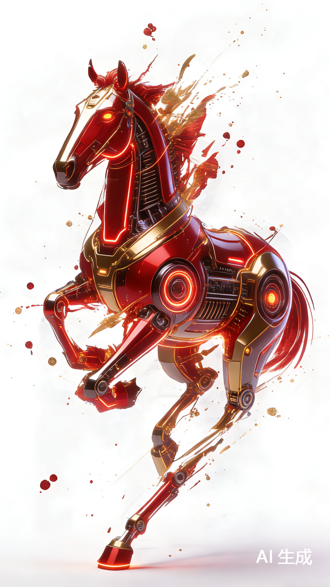 这匹红金机甲马,通体赤红的金属外壳包裹着精密机械结构,鬃毛如火焰炸裂,关节处的霓虹光效随动作流转,每一次抬蹄都带着飞溅的金红碎屑。新年的红火与科技的硬核在此融合,这匹“烈焰神驹”是青年学子“燃动未来”的宣言。