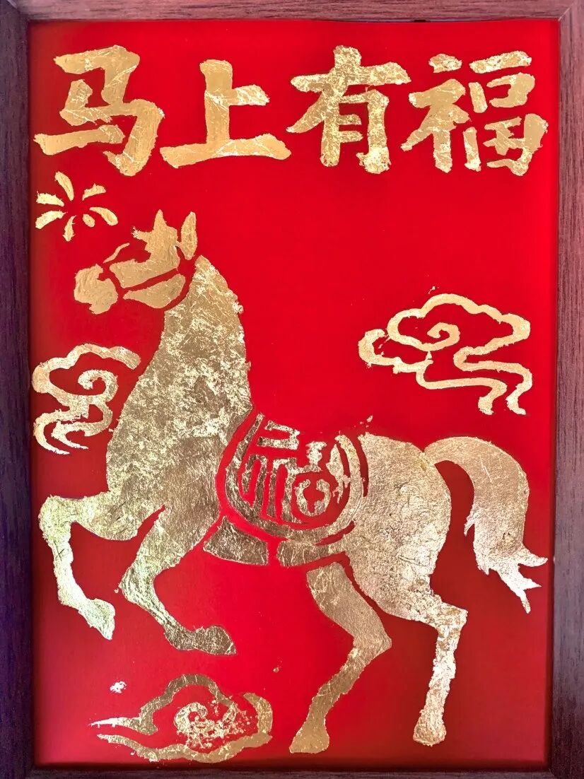 陆怡彤同学的金箔画以“马上有福”为主题,大红为底,金箔贴出昂首扬蹄的骏马,鞍鞯处融入“福”字,祥云环绕。金箔与红底的碰撞,让“马”的形象既有传统韵味,又充满力量感。一份“马到成功、福运自来”的祈愿,就在这鎏金光影间静静流淌。