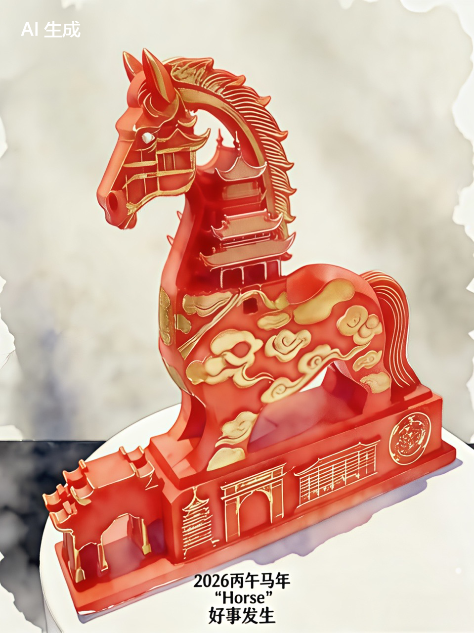 这尊红金配色的骏马作品,将传统建筑轮廓融入造型,祥云纹饰与篆刻纹路铺陈其间,“2026丙午马年 好事发生”的字样直戳人心。红金配色喜庆庄重,这匹“瑞马”以AI为笔、以传统为魂,在数字世界里为新年祈福。