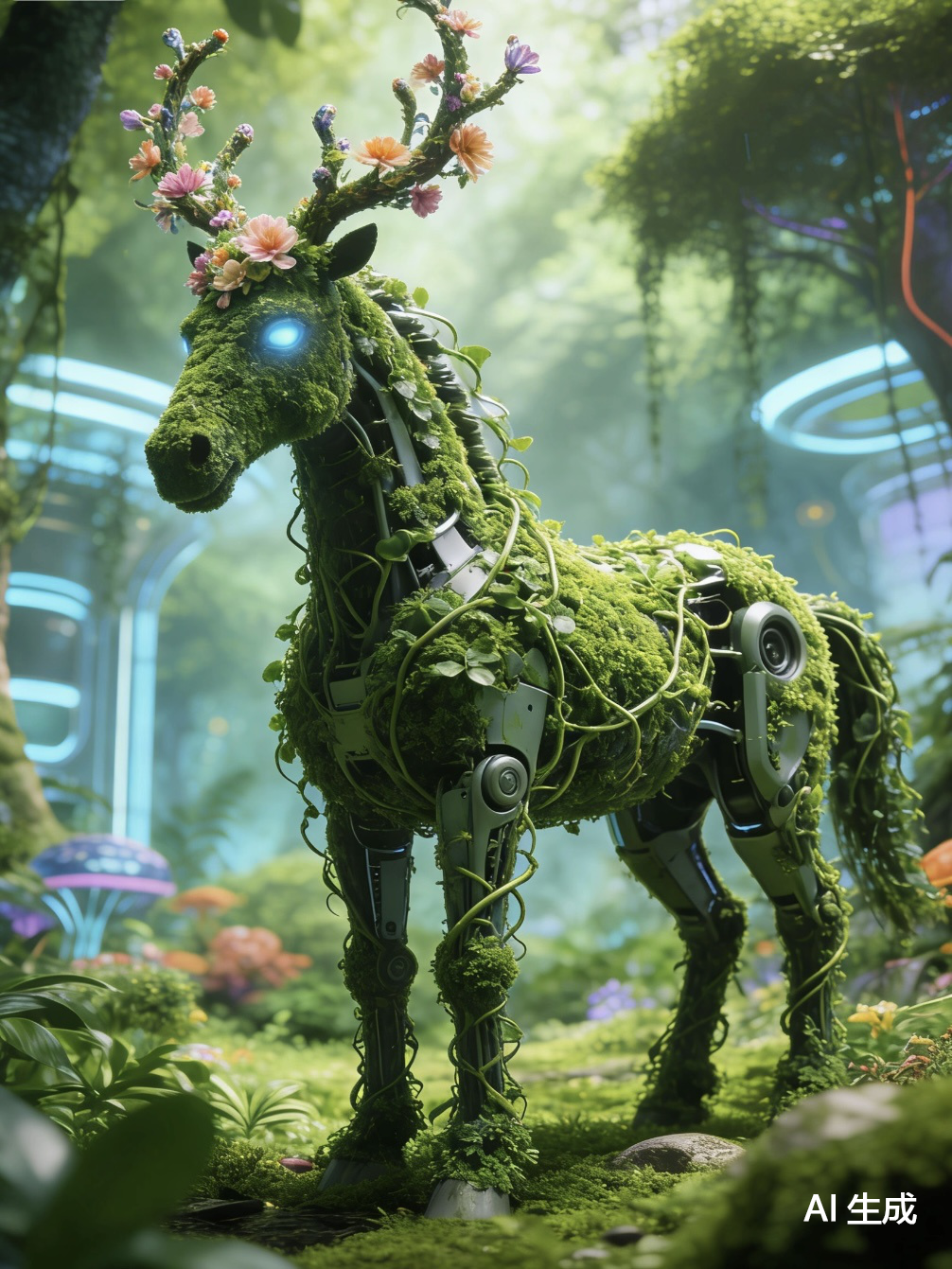 谁能拒绝一只“长在雨林里”的机械独角兽?金属骨架上爬满翠绿蕨类,鬃毛是发光的蓝绿色光纤,胸口的能量核心亮着暖光,每一步都踩出荧光蕨类的印记。赛博朋克与生态雨林的碰撞,有未来科技的酷炫,也有自然生命的温柔。