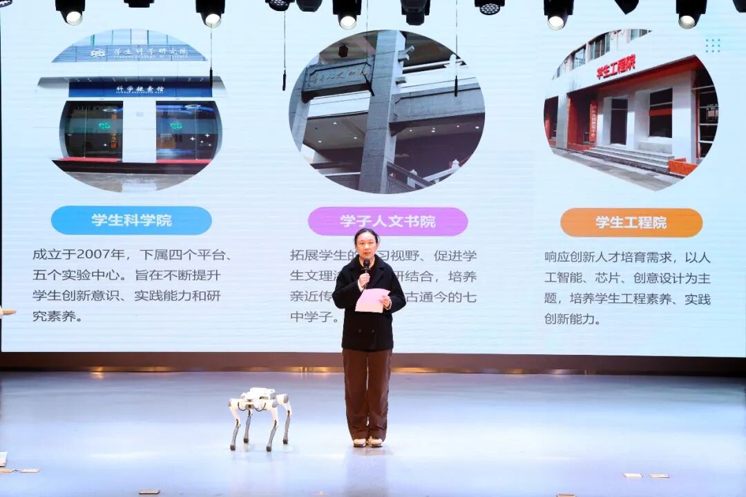 崔懿老师则系统梳理了学校科技教育的发展历程,从2007年成立学生科学院,到2019年筹建学生工程院,再到如今引入具身智能机器狗、自动辅助驾驶载具等前沿设备,学校始终秉持“人文、研究、创新”的育人生态,为学子搭建起探索科学、绽放创意、实现梦想的广阔平台,推动科技教育从“科普体验”向“硬核创新”稳步跨越。