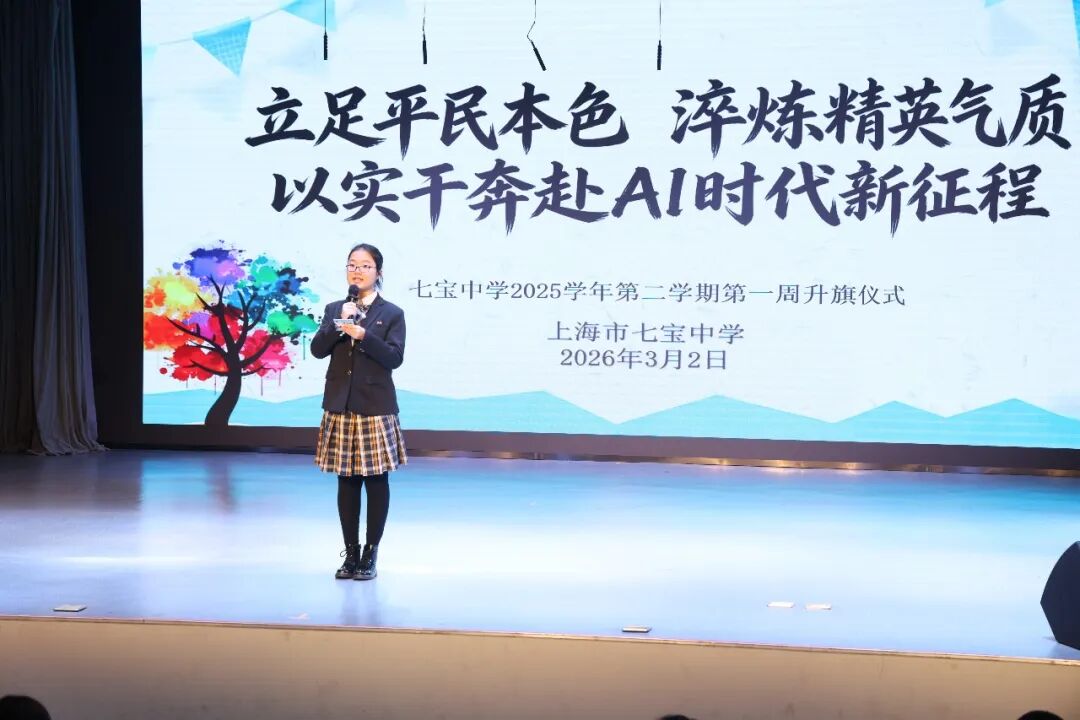 春潮启新程,笃行向未来。2026年3月2日,七宝中学2025学年第二学期开学典礼在小剧场隆重举行。本次活动以“立足平民本色 淬炼精英气质 以实干奔赴AI时代新征程”为主题,激励全校师生以实干精神拥抱AI时代,在新学期携手谱写育人兴校的崭新篇章。