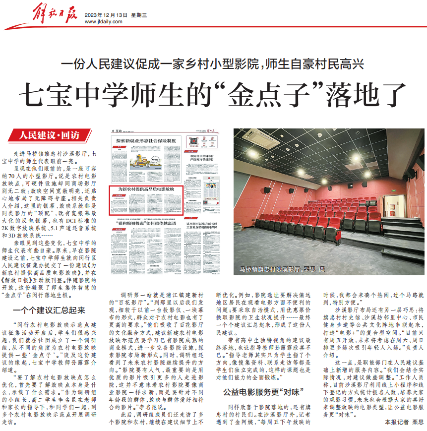 2023年7-12月,李名昆、强烨俊等同学参与闵行区文化赋能公共空间征集活动,深入建新村等乡村放映点实地调研,聚焦农村放映点片源单一、老年群体观影需求未被满足等问题建言献策,相关“金点子”获《解放日报》《学习强国》等媒体平台宣传报道。12月,七中学子走进沙溪影厅回访验收,建议落地见效,相关机制还被纳入闵行区放映点工作方案,让乡村文化生活焕发新活力。