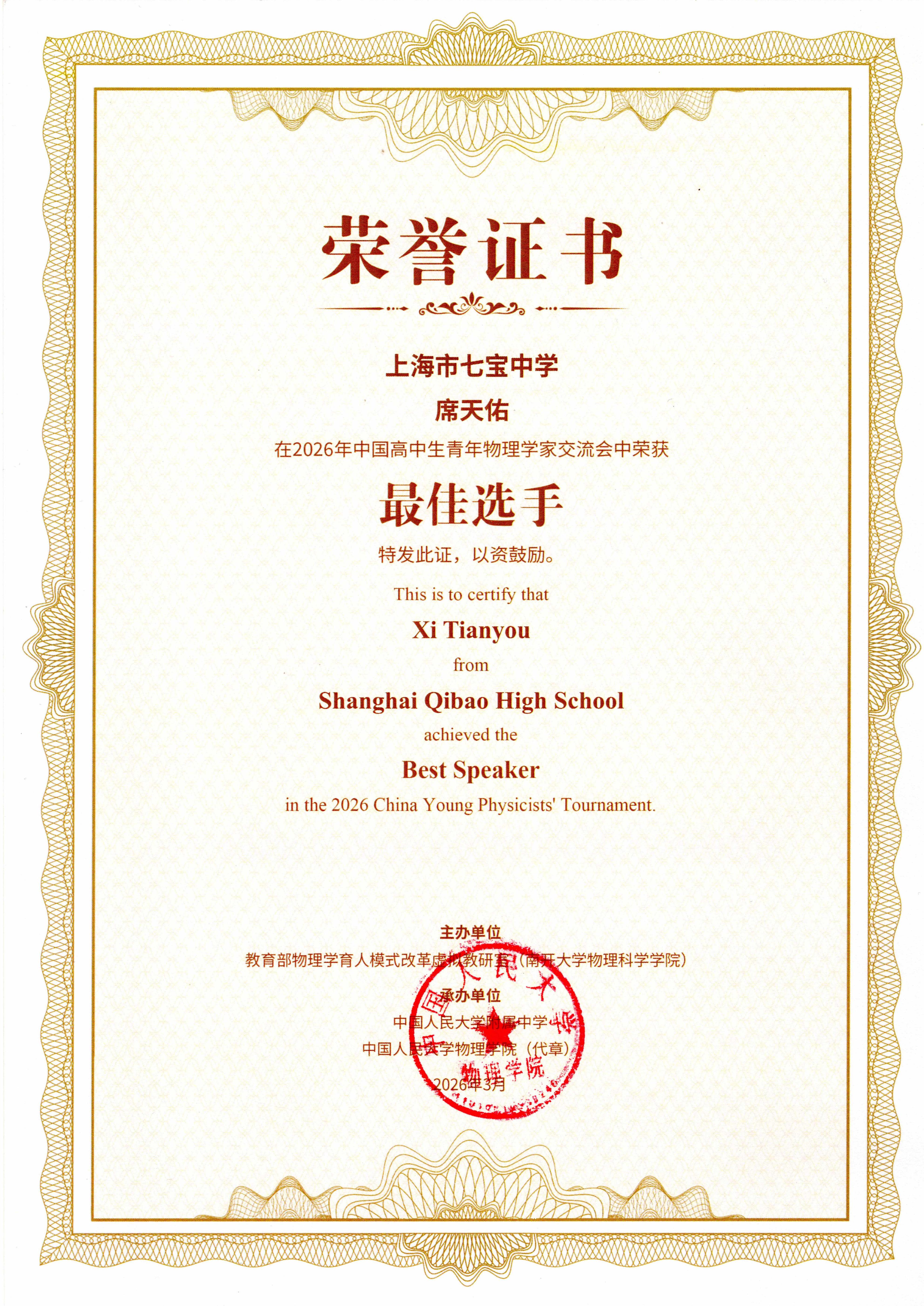 七宝中学辩物论理队获中国高中生青年物理学家交流会二等奖