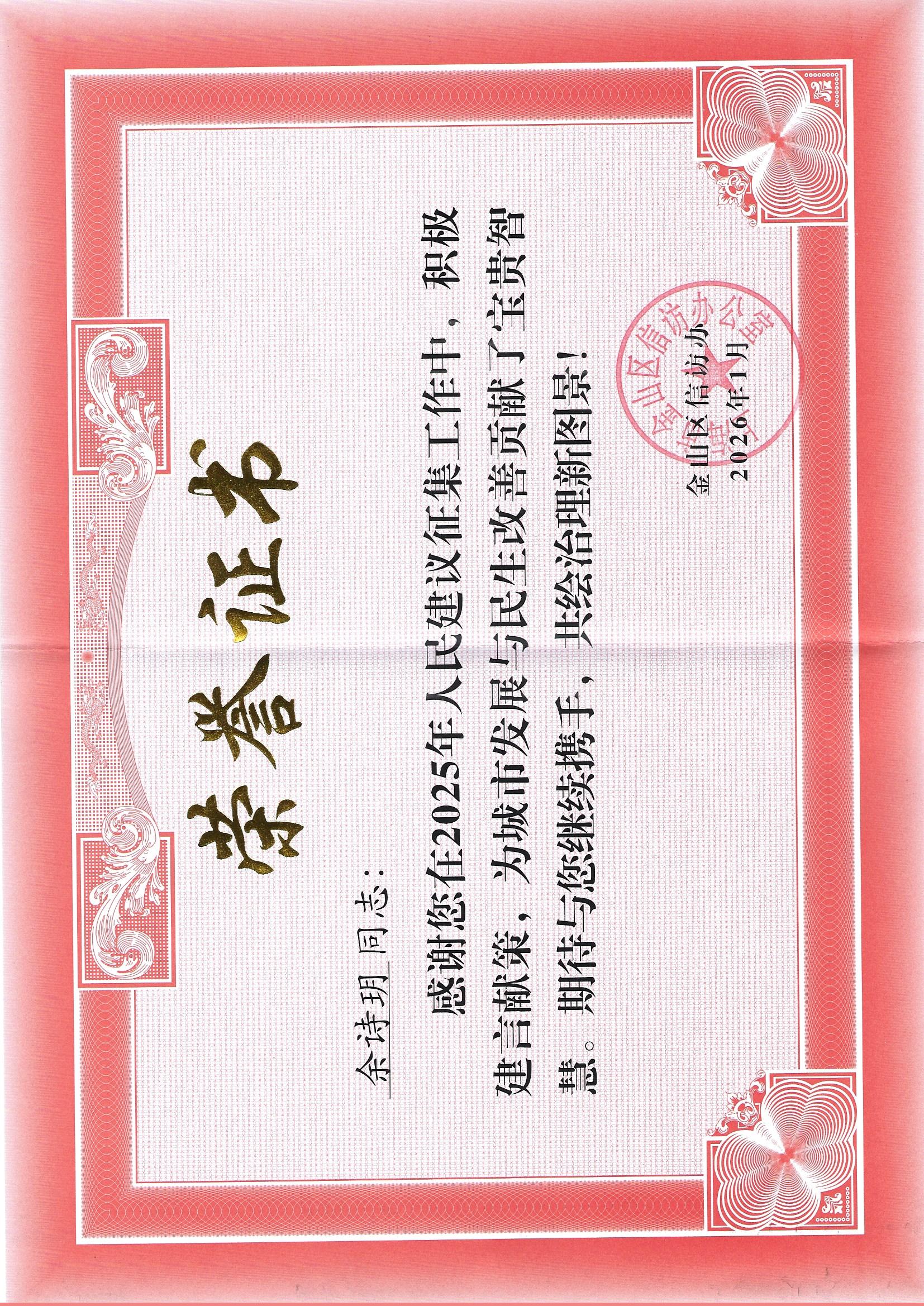 余诗玥同志在2025年人民建议征集工作中为城市发展与民生改善贡献宝贵智慧
