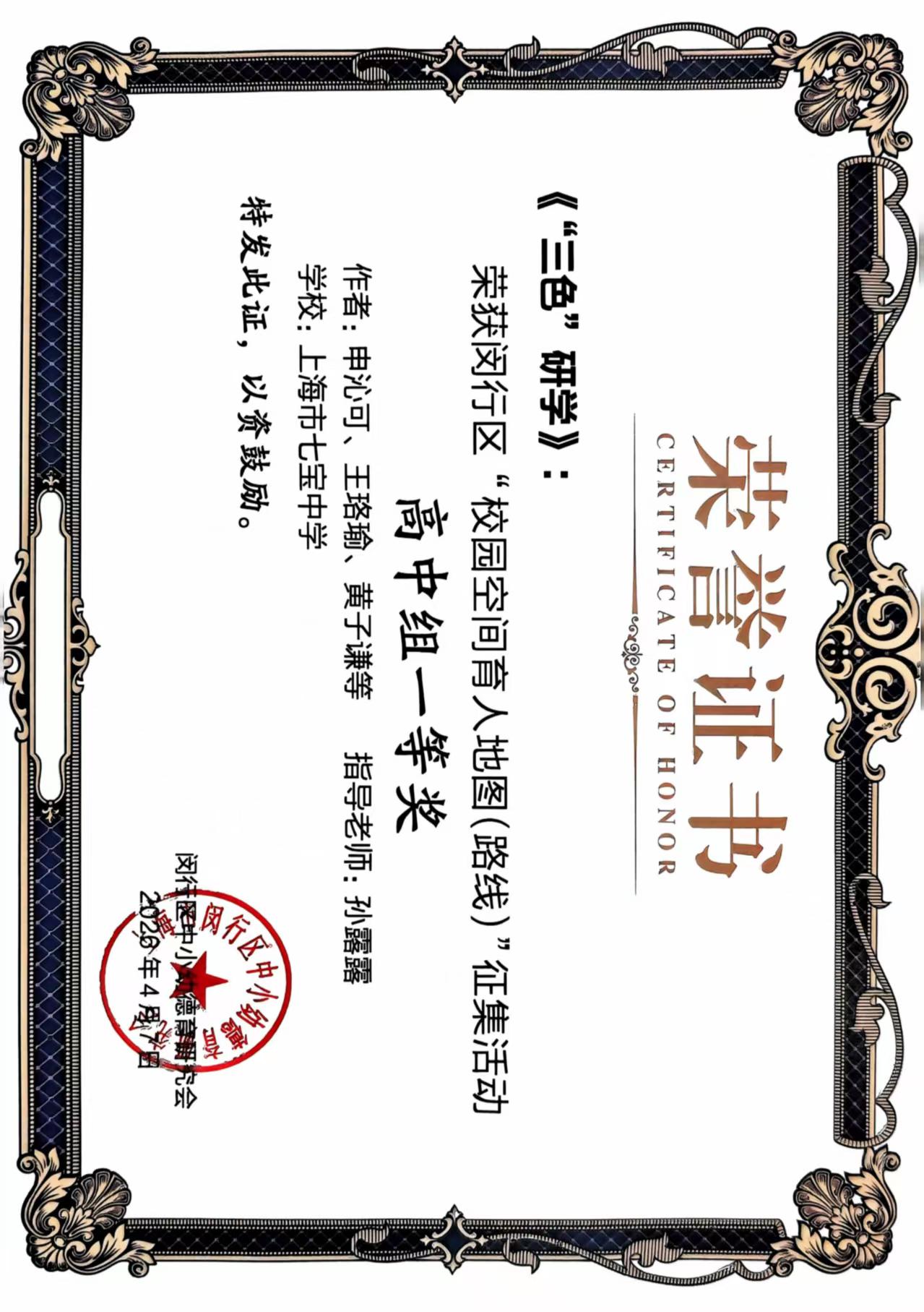 申沁可、王珞瑜、黄子谦等《“三色”研学》荣获闵行区“校园空间育人地图(路线)”高中组一等奖