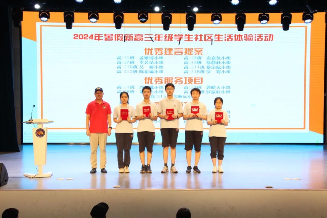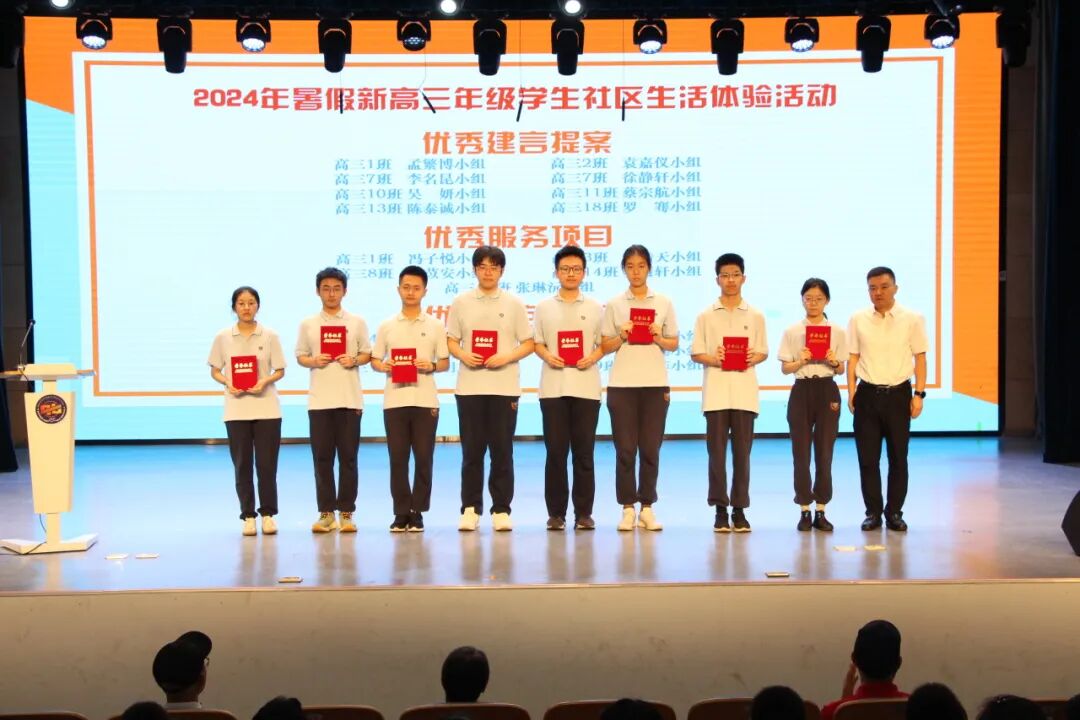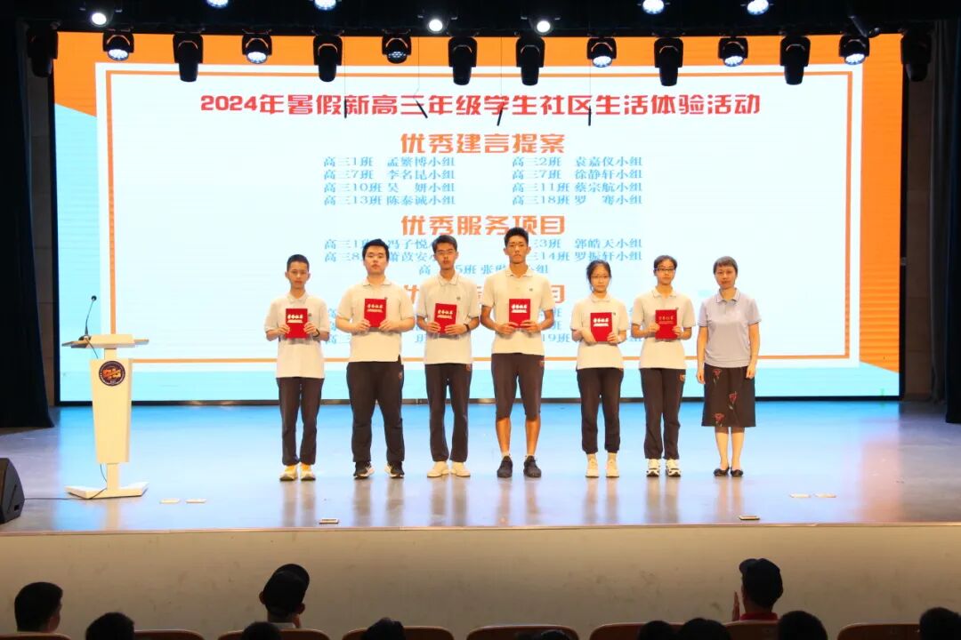 随后,校领导对在高三年级社区挂职锻炼中展现出卓越才能和团队精神的同学及小组代表进行了表彰,颁发了荣誉证书,以此激励全校学生积极参与社会实践,勇于担当社会责任。