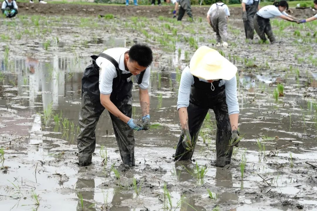 水田里,插秧班级的同学成了“小农夫”。他们撸起裤腿,弯下腰身,小心翼翼地将一株株嫩绿的秧苗插入泥土。泥水沾湿了衣服,汗水浸透了发梢,但专注的神情和逐渐成行的秧苗,是他们对“粮食来之不易”最真切的体会。