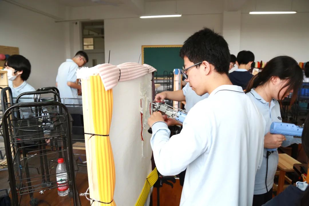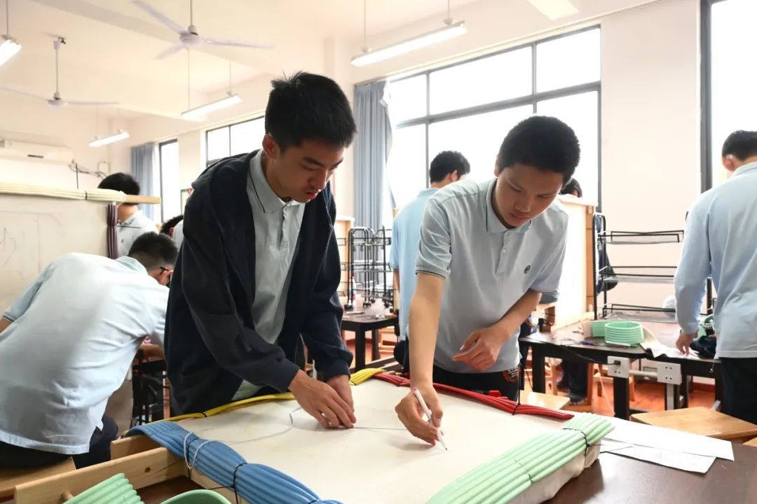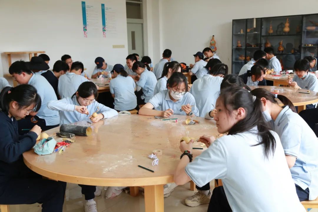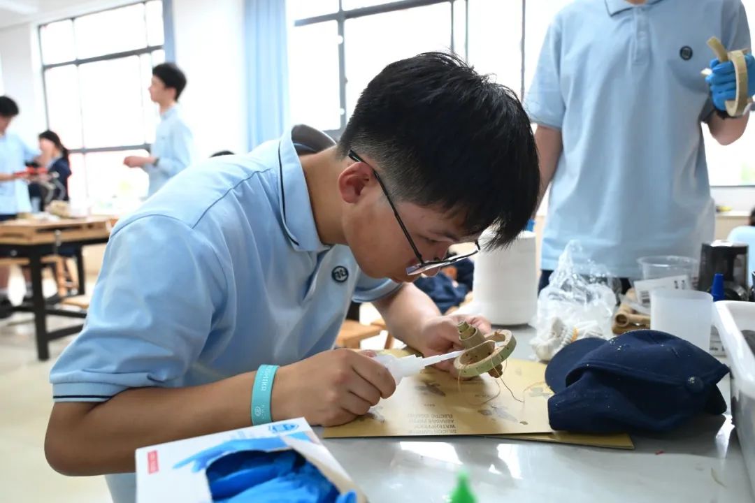 在木工课堂上,有的同学专注学习车珠子技艺:选材、测量、打磨、钻孔,一丝不苟地完成每道工序,看着粗糙的木料在自己手中逐渐蜕变为精致的珠饰,亲身感受着创造的乐趣与专注的力量。与此同时,另一部分同学则沉浸在竹风铃的制作中:他们精心挑选心仪的竹片和竹环,经过竖劈、横锯、打磨、穿孔、系绳等一系列步骤,最终都完成了独属于自己的那份精巧“纪念品”。