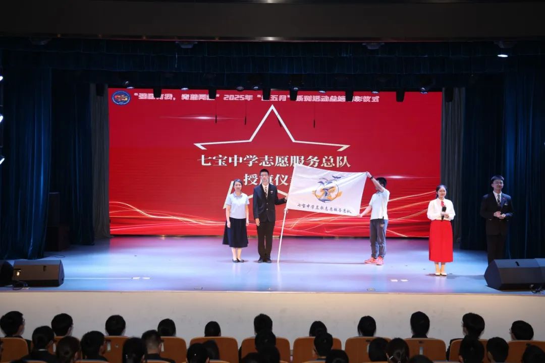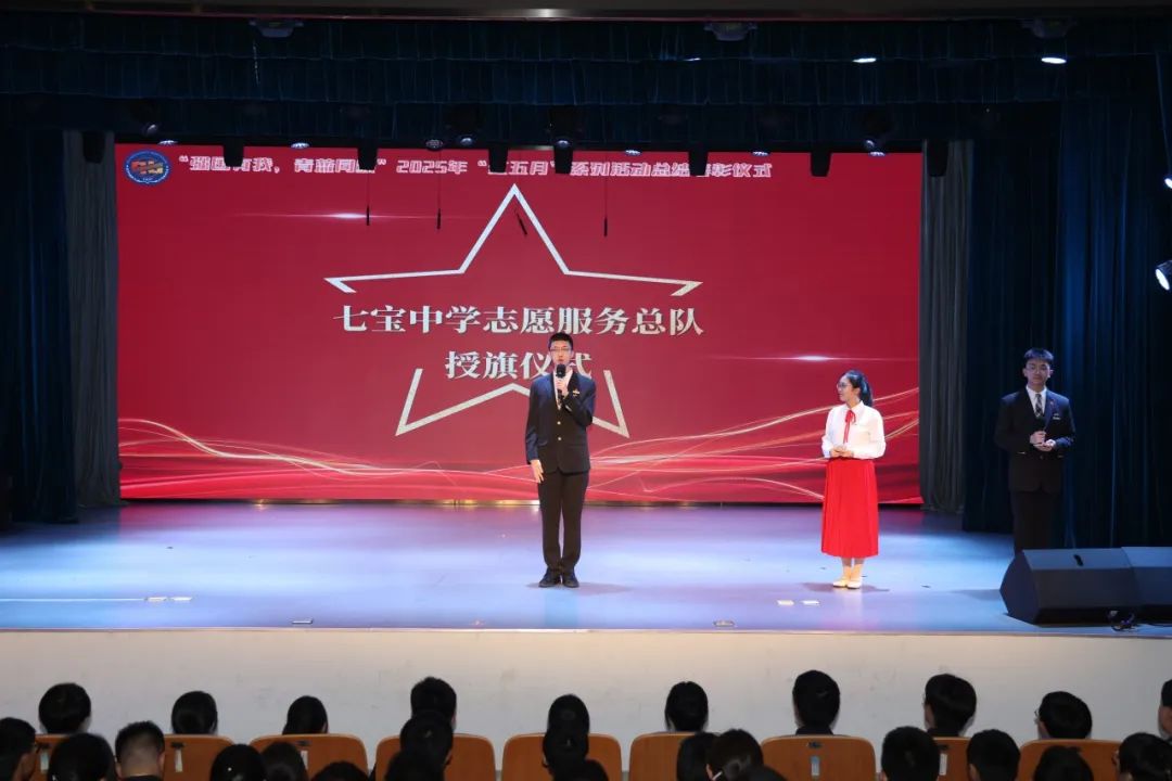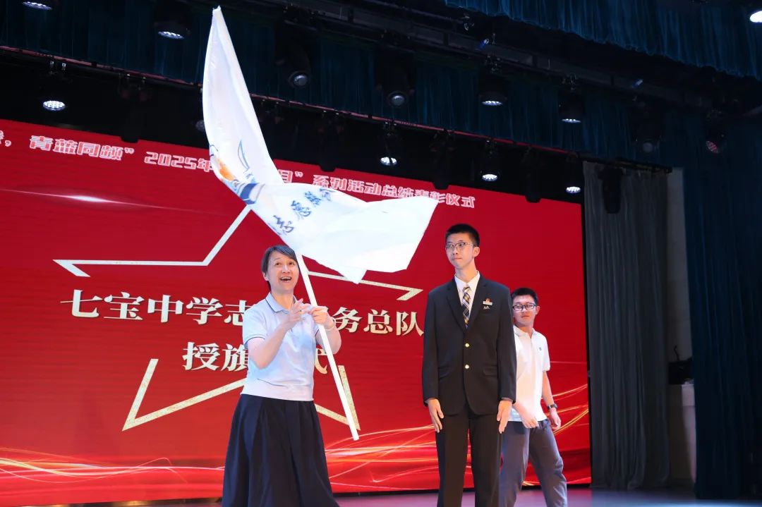 活动现场,举行了隆重的授旗仪式。七宝中学志愿服务总队队长、高一(11)班李申泽同学上台,代表七中学子从七宝中学党委书记、校长朱越老师手中接过了这面象征责任与奉献的旗帜。随后,李申泽同学代表志愿服务总队庄重宣誓。