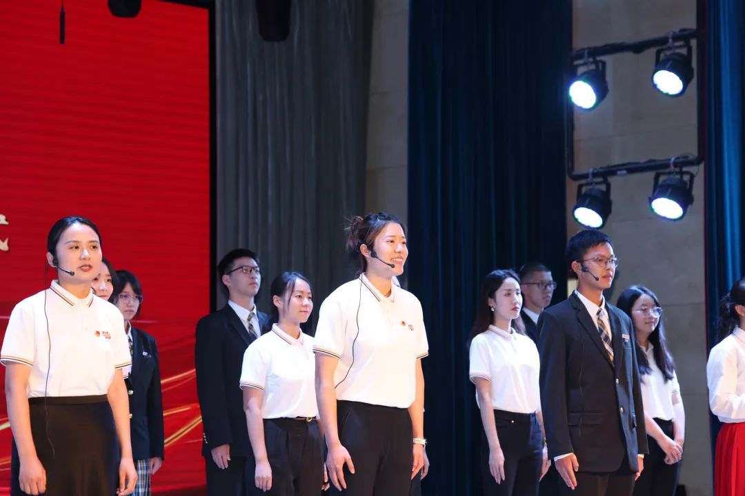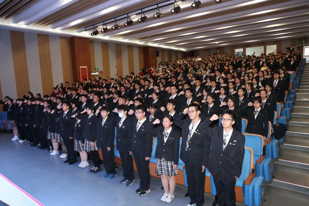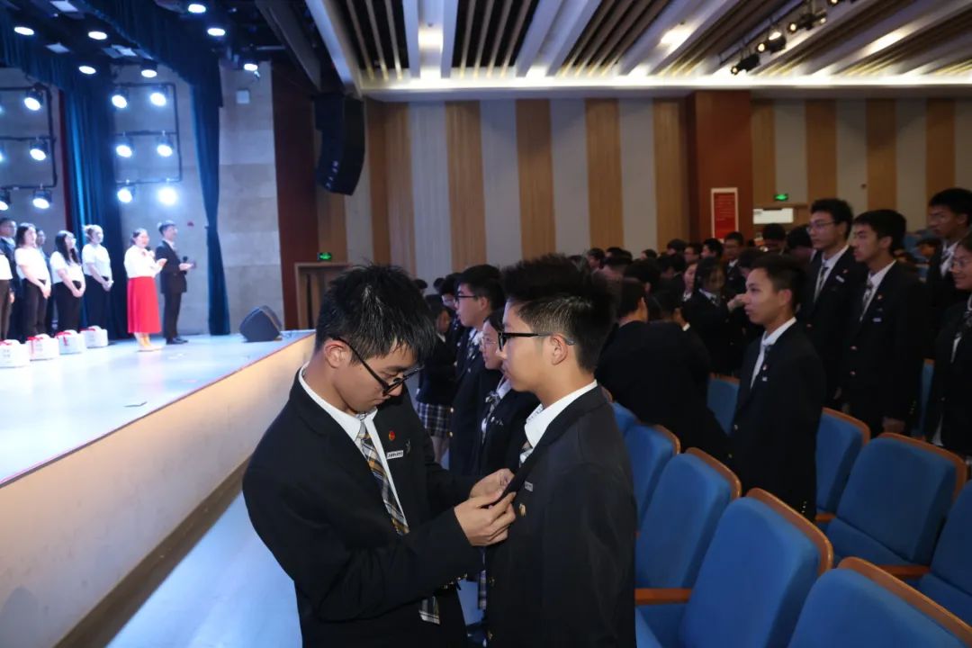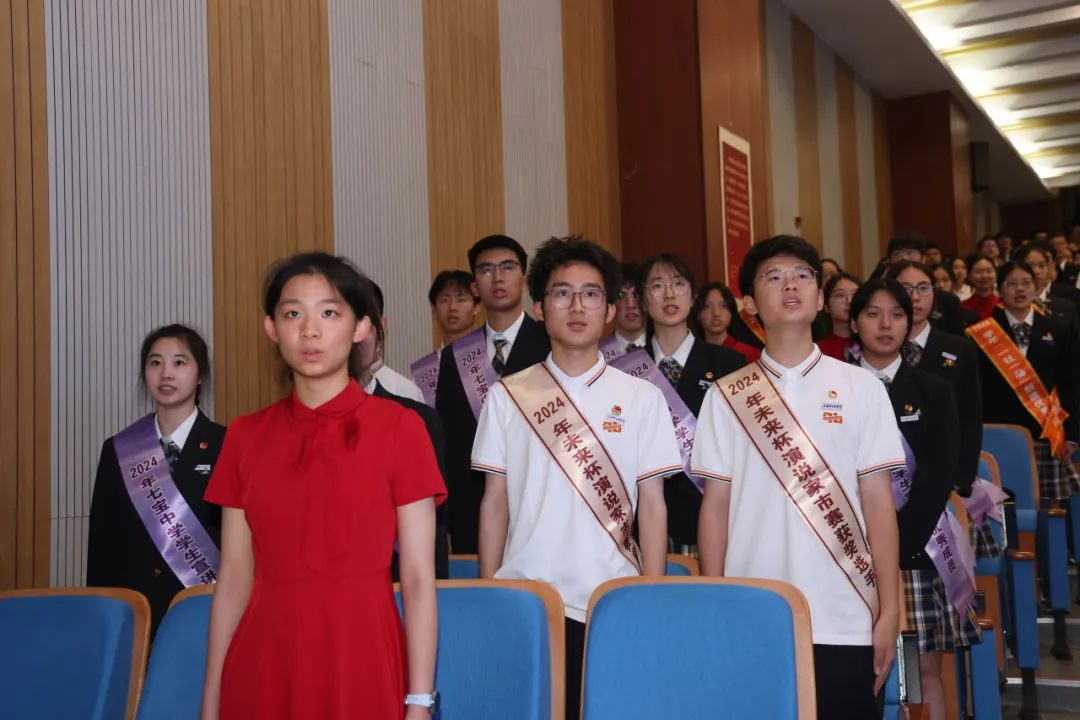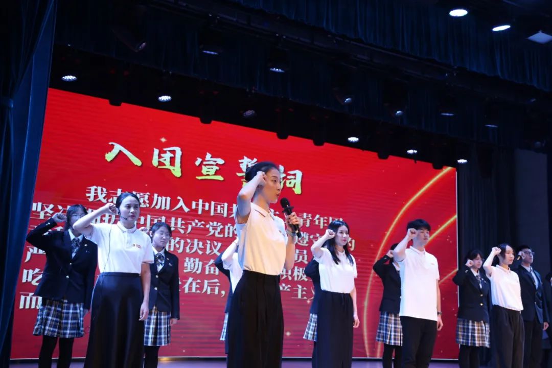 接下来,台上的老师们和各班团支书,为新团员佩戴上了光荣的团徽。在七宝中学教工团支部书记姚若曦老师的带领下,新团员、青年教师与在场的全体七中团员一起庄严宣誓。