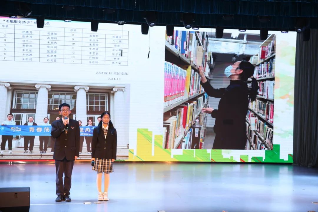 青年教师代表汤云珊、陈天奕老师,新团员代表高二(3)班杜鸿来、高二(18)班朱晨希同学上台,道出了他们的真挚心声。随后,校团委副书记党秋尘老师上台,为青年老师们颁发了离团纪念品。