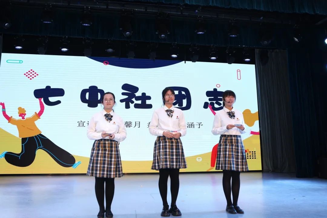 社团联部长梁馨月、盘思琪、路涵予同学,为新生们展示七中社团风采,并介绍社团联组织架构,还强调了社团活动的纪律和制度。三位学姐诚挚地向同学们发出“社团召集令”。新生们跃跃欲试,期待着加入心仪的社团。