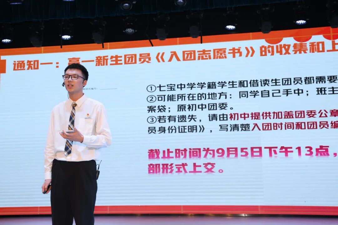 团委理论学习部长王家宸和杨济诚同学以风趣幽默的开场,介绍了班级团支部的基本构成、理论学习活动以及七中团员管理体系等内容,并细致提醒同学们注意新学期团务工作的时间节点和细节。
