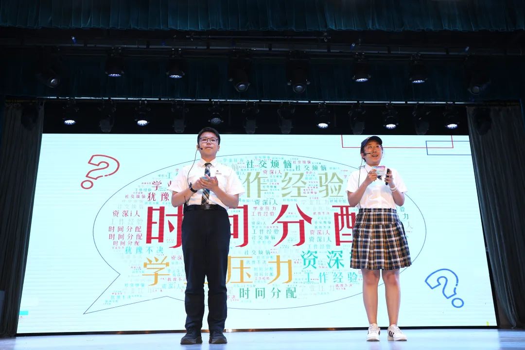 团委理论学习部长刘子涵、学生会体育部长王涛和学生会生活服务部长叶欣,向同学们介绍了七中自主管理体系,提出学生干部应具备的素质与能力,鼓励同学们发挥所长,积极参与,追求卓越自我。曾任七中校团委副书记,现就读于复旦大学的徐紫琳学姐与曾任七中社团联主席,现就读于上海交通大学的魏家好学长惊喜返场。围绕如何实现高中学业和学生工作的双赢展开分享,并诚挚邀请七中新生加入团委学生会和社团联大家庭。