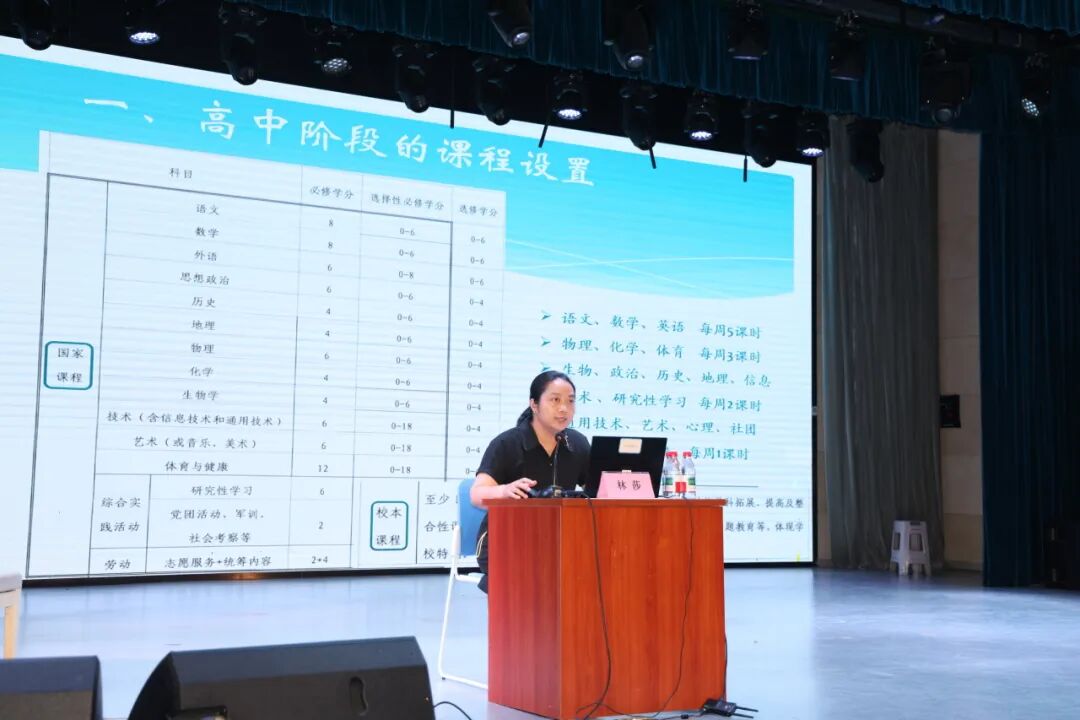 接着,教务处副主任林莎老师以“高中阶段课程学习”为主题展开讲座。她从课程设置、课程实施、高中阶段的学习建议三个维度对七宝中学丰富多元的课程进行详细介绍,鼓励同学们用研究的方法思考,用探究的精神学习。