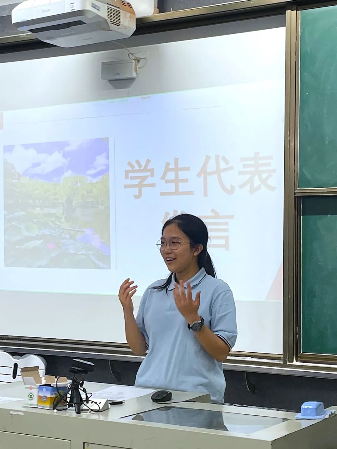语文教研组组长周勤丰老师作为导师代表发言,她动情地表示:“导师制不仅是学业与心灵的‘双引航’,更是个性化成长的‘催化剂’。我们愿以文化浸润为引,以陪伴为舟,守护每一位同学稳健前行。”学生代表依次上台,分享他们与导师之间的温暖故事。史宜闻回忆到暑假期间张佳欣老师带领学生前往外文书店开展阅读实践活动;方嘉乐讲述了导师组成员与罗静老师共读《红岩》、解码精神基因的收获;金家逸分享了光佳老师带领导师组成员参观沪上三所红色旧址的深刻体悟;黄睿宁则感动于姚若曦老师“亦师亦友”的真心陪伴。真挚的讲述中,是导师们用智慧与温暖照亮青春成长路的生动缩影。