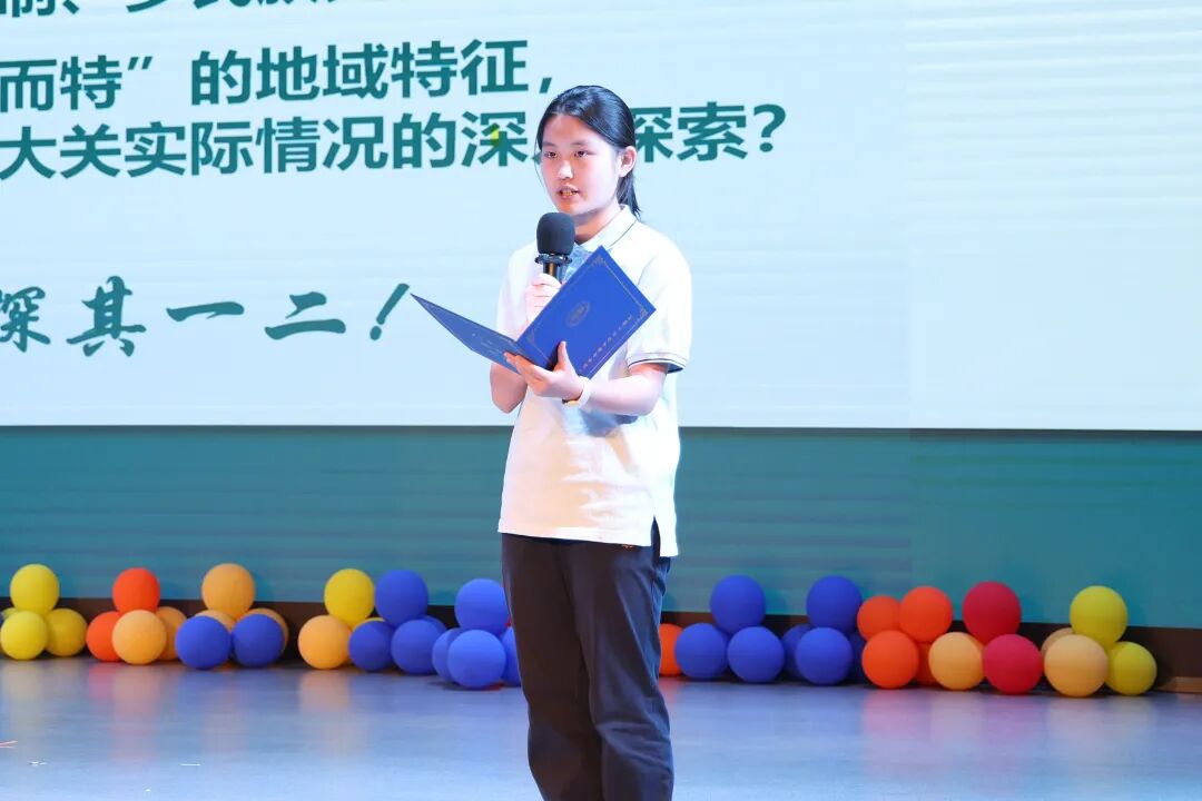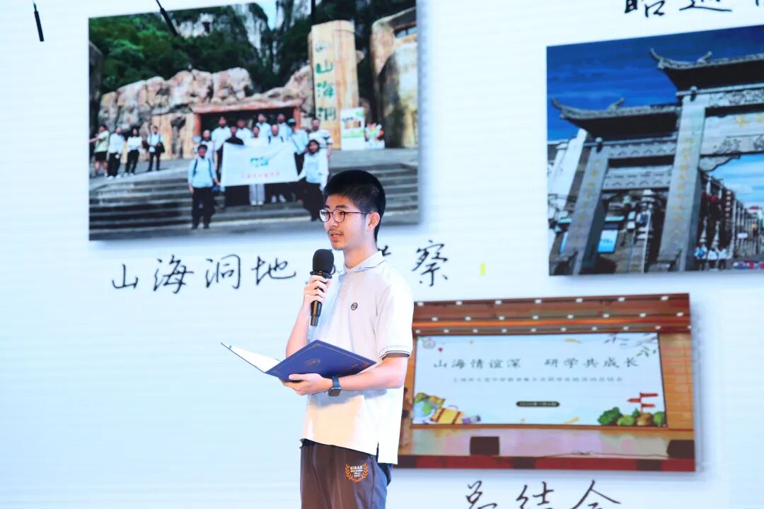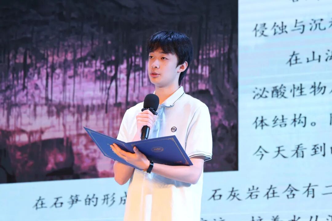学生代表潘俊恺同学带领大家“重回”大关。他讲述了暑假期间研学活动的难忘瞬间:同学们踏过石阶走进大关一中校园,在黄连河瀑布畔感受万年流水的自然伟力,在山海洞中探究喀斯特地貌的奥秘。随后三个课题组学生代表依次登台,展示融合实践与思考的研学成果: