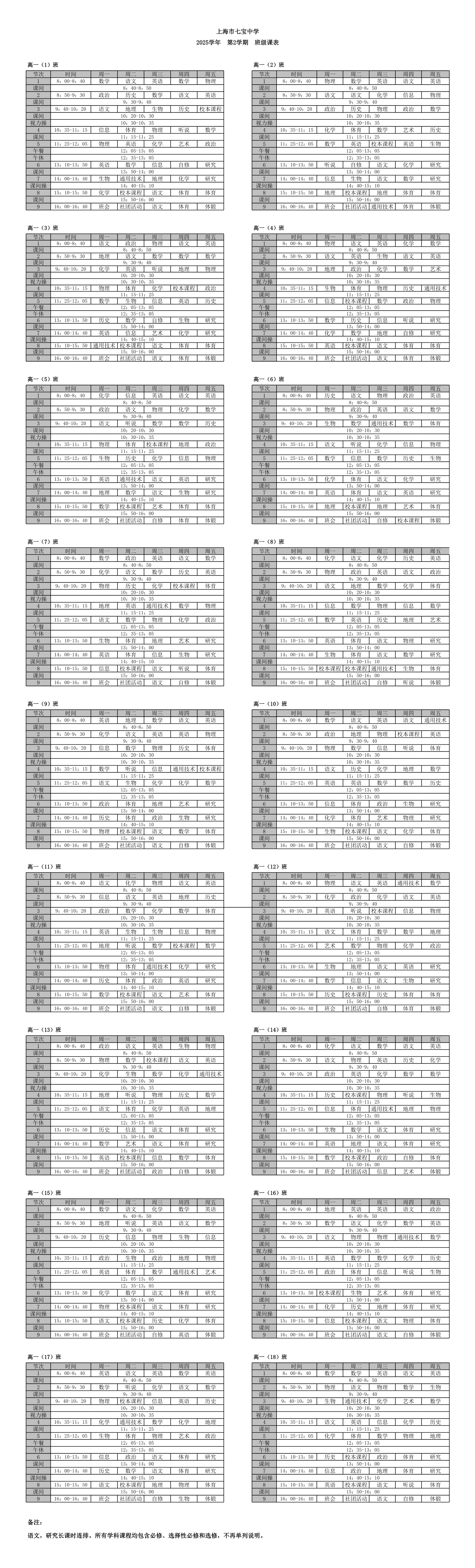 2025学年第2学期高一班级课表