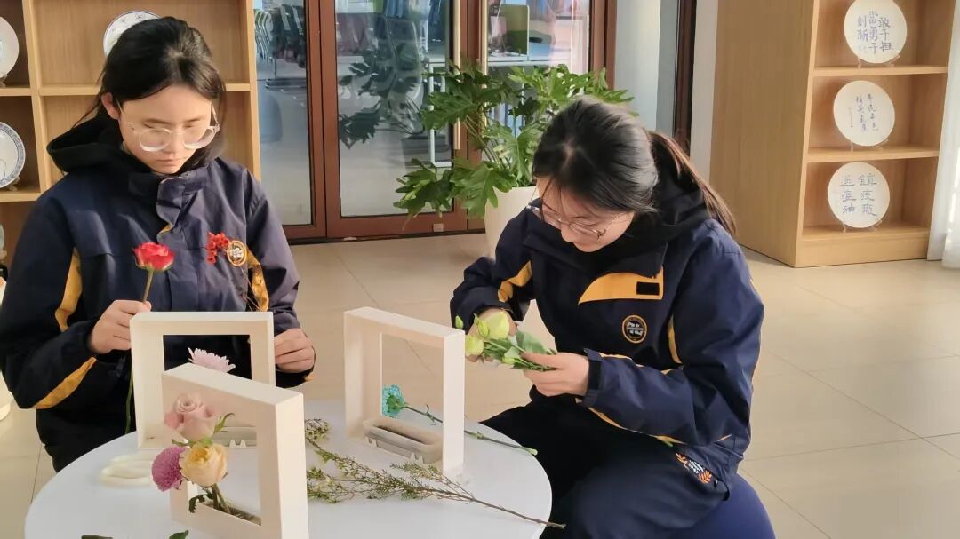寒假期间,花艺社与书画社的社员们化身“小老师”,带领石榴班的同学们在花间寻韵、在笔墨传情。花艺课堂上,高二4班顾心言、高二17班陈敏静两位“小老师”精心设计相框花制作与盘花课程,带领同学们创作出一件件独具特色的作品;书画教室内,高二4班陆一诚、高二9班邵燚两位“小老师”从书法起源讲起,指导同学们练习春联书写。墨香氤氲间,一个个饱含年味的汉字跃然纸上。