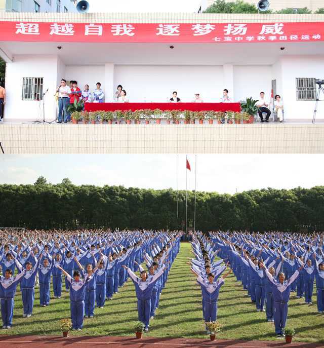 2008年9月27日,在这金秋时节七宝中学举行了“超越自我,逐梦扬威”秋季田径运动会。上午7:40时,七中学子们用洋溢着青春与活力的团队表演拉开了运动会的序幕,七宝中学仇忠海校长为大会作了发言,最后由运动会组委会主任校团学联主席胡润田同学宣布了运动会比赛正式开始。