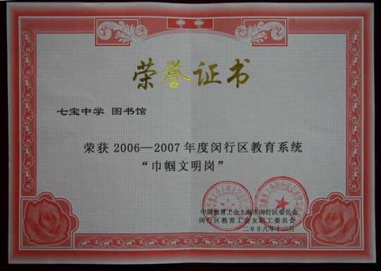 七宝中学图书馆----获2006--2007年度闵行区教育系统巾帼文明岗(证书)