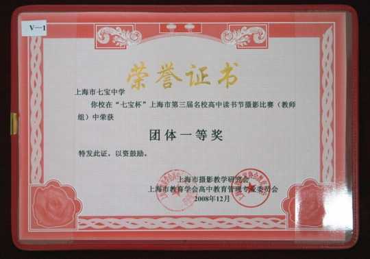 2008.12七宝中学----获七宝杯上海市第三届名校高中读书节摄影比赛(教师组)团体一等奖(证书)