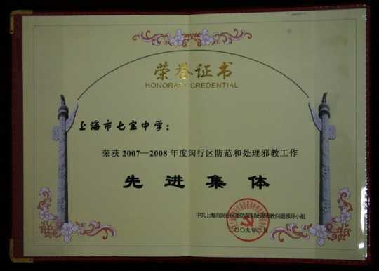 七宝中学----获2007--2008年度闵行区防范和处理邪教工作先进集体(证书)