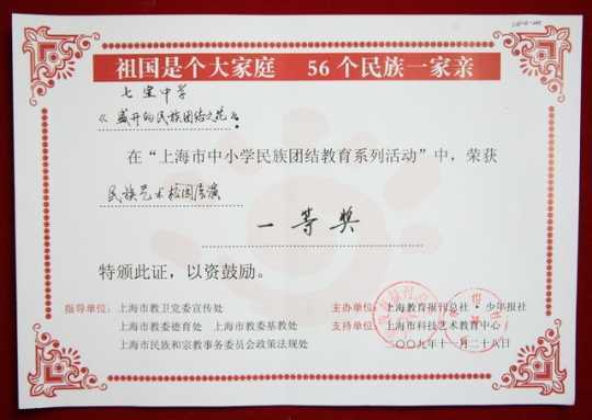 2009.11七宝中学(新疆部)----(盛开的民族团结之花)获上海市中小学民族团结教育系列活动民族艺术校园展演一等奖(奖状)
