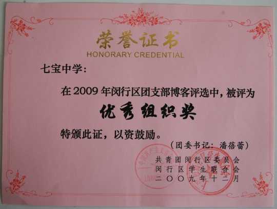 2009.12七宝中学----评为2009年闵行区团支部博客评选优秀组织奖(证书)