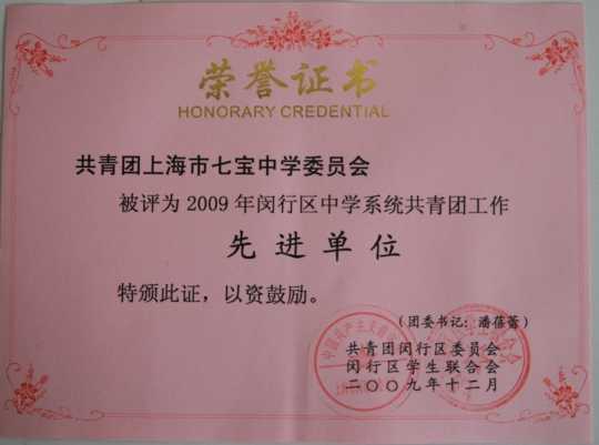 七宝中学团委----评为2009年闵行区中学系统共青团工作先进单位(证书)