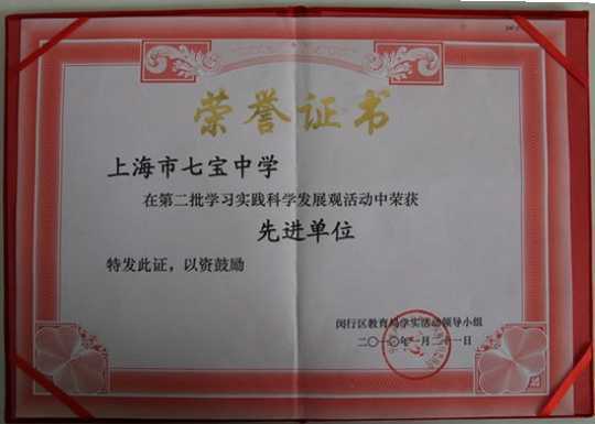 七宝中学----获第二批学习实践科学发展观活动先进单位(证书)