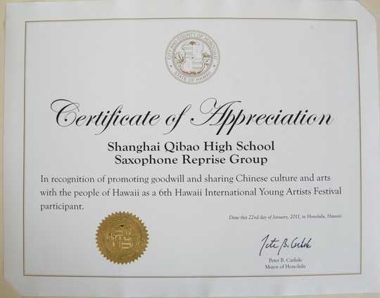 七宝中学萨克斯重奏团----获美国第六届夏威夷国际青少年音乐比赛优秀组织奖;节目《茉莉花》获一等奖