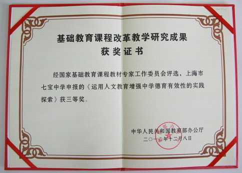 2010.12七宝中学----课题《运用人文教育增强中学德育有效性的实践探索》获国家基础教育课程改革教学研究成果三等奖(证书).jpg