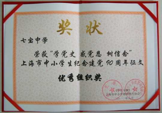 七宝中学----获“学党史,感党恩,树信念”上海市中小学生纪念建党90周年征文优秀组织奖(奖状)