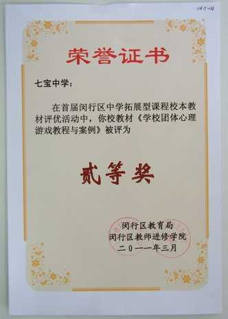 七宝中学----教材《学校团体心理游戏教程与案例》获首届闵行区中学拓展型课程校本教材评优二等奖(证书