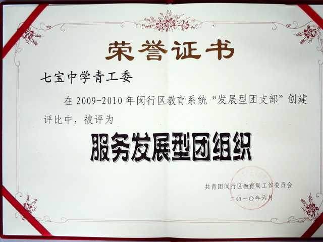 七宝中学青工委----被评为2009--2010年闵行区教育系统“服务发展型团组织”(证书)