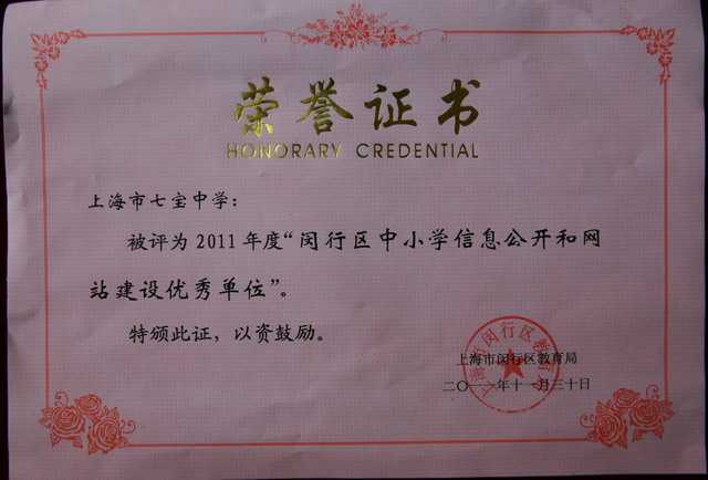 七宝中学----被评为2011年度“闵行区中小学信息公开和网站建设优秀单位(证书)